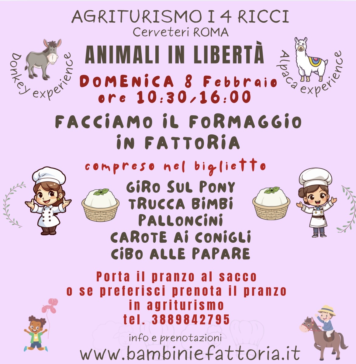 - ingresso libero alla fattoria a contatto diretto con gli animali (pecore, capre, asino, maialino, conigli e altri).